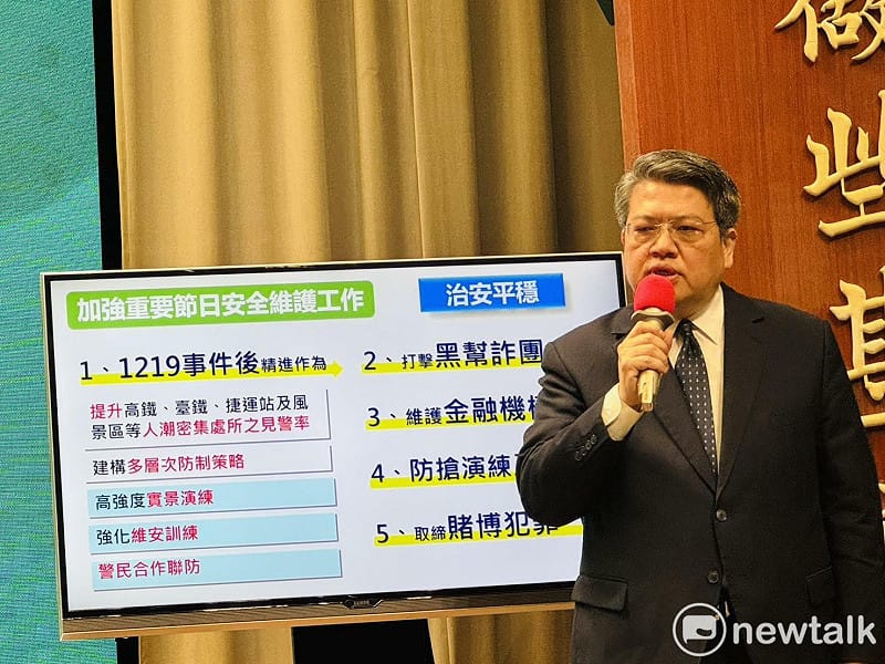 行政院會今(5日)由各相關部會提報春節期間強化執政措施。內政部長劉世芳表示,鑒於近期發生隨機襲擊案件,以及因應115年農曆春節連續假期將至,警政署將於2月9日22點起至23日24點止,共計15天實施「115年加強重要節日安全維護工作」,由全國各警察機關以「治安平穩、交通順暢、民眾安心」為工作主軸,執行各項勤務。