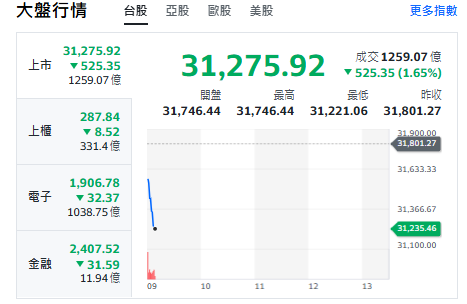 台股今天(6日)開黑走跌,約9點10分前,跌深525點,最低來到31221,跌破32000。上櫃、電子與金融類股全走跌。重要電子權值股,約9點20分前,台積電跌15元、來到1750元。 鴻海跌2.5元、來到213元。台達電跌20元、來到1130元。聯發科跌60元、來到1710元。廣達跌3元、來到270元。