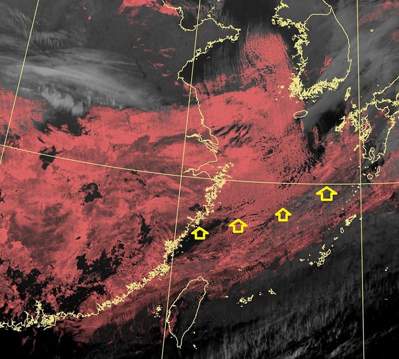 對此,鄭明典今日在臉書上分享夜間的衛星雲圖。鄭明典解釋,夜間影像也可以辨識雲街,圖片中紅色代表液態水含量高的低雲或霧,白灰色則是冰晶為主的中高雲。目前已可以很明顯地看到,代表極冷空氣前緣的雲街,已在台灣上方,且幾乎都是低雲,預計等雲街到達,氣溫還會有另一波下溫。