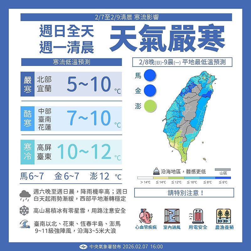 中央氣象局指出,今(7)日寒流南下,中部以北、宜蘭及花蓮氣溫明顯下降,天氣轉為濕冷。週日夜間至週一(2/9)清晨將是本波寒流影響最明顯、氣溫最低的時段,但白天起寒流逐漸減弱,氣溫緩步回升;不過好天氣維持不久,週三(2/11)起鋒面通過,東北季風增強或大陸冷氣團再度南下,氣溫將再度轉涼,影響時間可能延續至週五,民眾仍須留意氣溫變化並做好保暖準備。