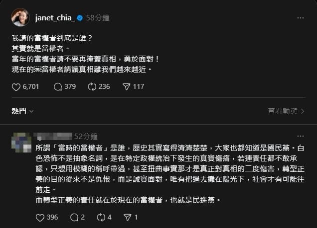 另一派網友則將焦點轉向現任政府,指出轉型正義的推動關鍵在於現在的執政者,有留言提到,監察院早在2023年2月公布調查報告,認定當年情治系統在案件偵辦過程中涉及誤導偵查方向、阻撓辦案、影響媒體輿論、包庇嫌疑對象等重大違失,強調「這不是猜測,而是國家正式調查結論」,呼籲政府應加速後續處理與檔案公開。