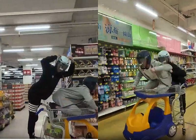 中國社群平台流行的「重慶機車」影片被多數人翻拍仿效。近日有2名男子為了低成本模仿,將賣場內的兒童專用車當重機使用,並在通道內高速滑行、甩尾,表演各式誇張特技,事後更將影片上傳網路,引起店家注意。家樂福將針對2名男子行為提出妨害名譽告訴。