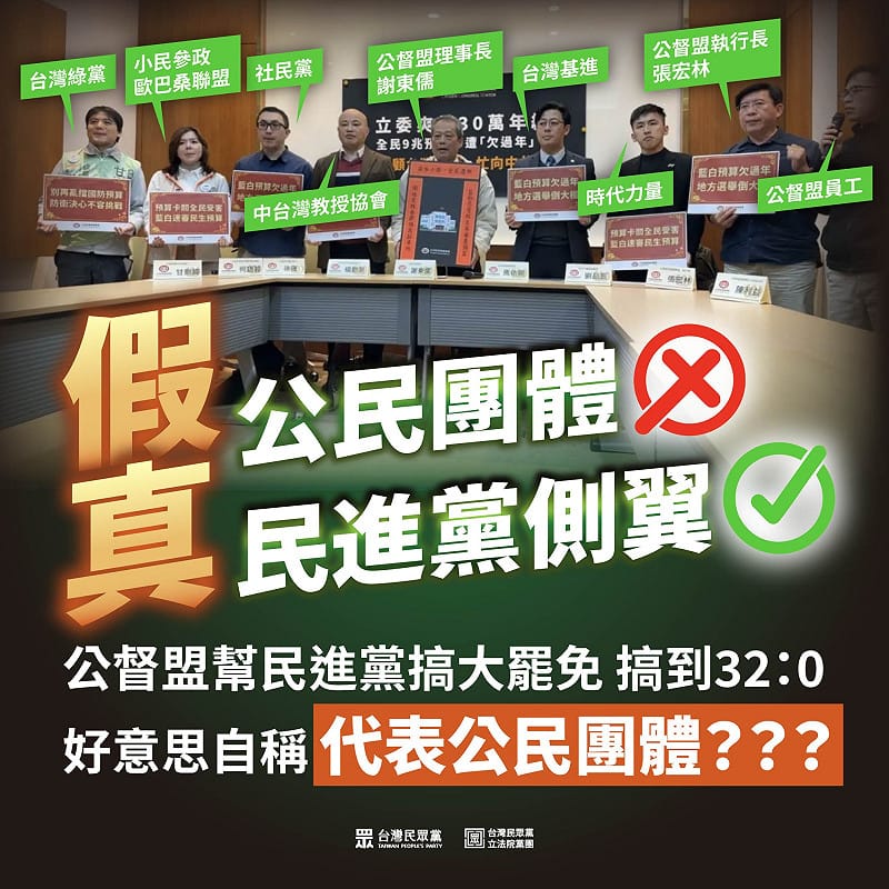 民眾黨團指出,曾經自詡為「監督國會」的公督盟,早已成為一個拒絕監督權力、一意為權力開脫的組織。他們出現根本的認知錯誤,完全不了解民主的本質是權力必須接受持續而公開的監督,而非一味護航。