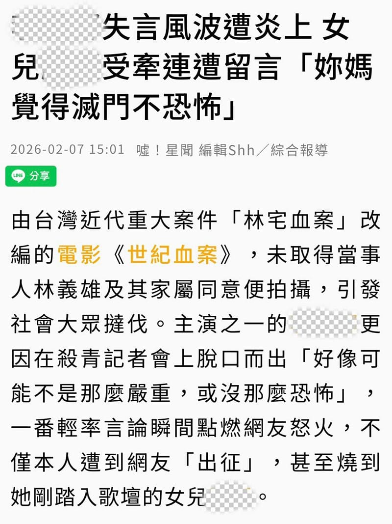 蘇巧慧今日在臉書貼文,不過,她把UDN報導「李千娜失言風波遭炎上 女兒顧穎受牽連遭留言「妳媽覺得滅門不恐怖」」上的名字用馬賽克模糊掉。她說,電影「世紀血案」所引發的爭議,導演和主要演員都已道歉,她請大家不要去追究、影響他們的家人。
