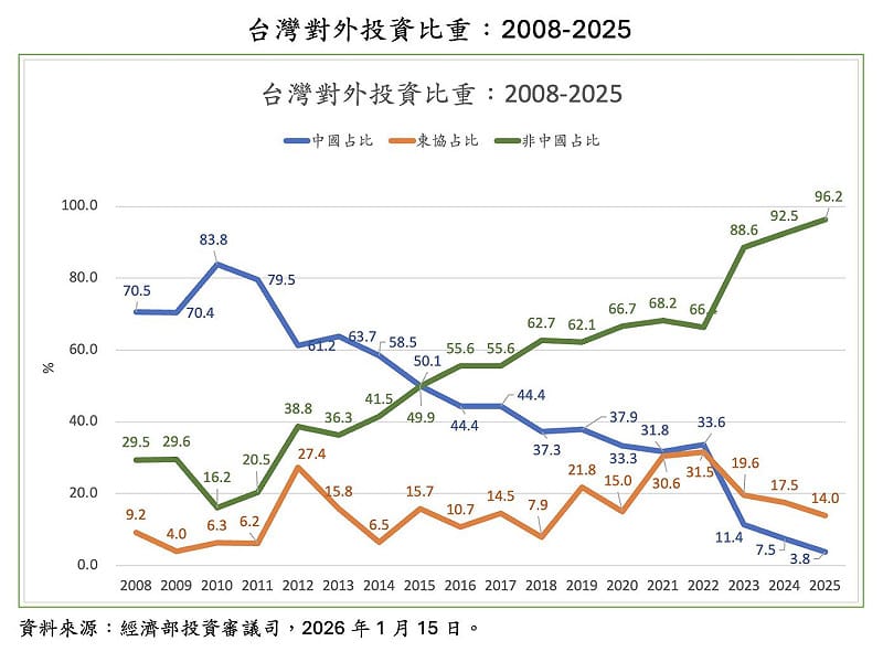 與此同時,台灣對非中國地區的投資比重則持續攀升。2016年,台灣對非中國地區投資首次超越對中國投資,成為重要分水嶺;2022年,占比進一步提高至66.4%。至2025年,台灣對非中國地區投資占比已高達96.2%,約為對中國投資的12倍,顯示台灣對外投資已呈現高度分散與多元布局的特徵。