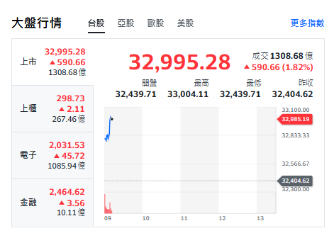 台股昨天 621點( 1.9%)、收32404點,約成交量6308億。分析師葉俊敏表示,回測31200結束,金融、半導體攻33000。