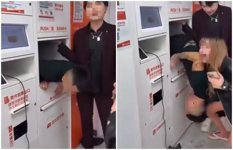 網友在社群平台上傳一段影片,一眾年輕人深夜大鬧蝦皮智取店,其中一名男子從自助寄件口爬進櫃子內,一旁友人紛紛起鬨大笑「把自己寄出去」、「這輩子睡過裡面的應該沒幾個」、「這包裹有點大,拿不動欸」,誇張行徑全被監視器拍下。