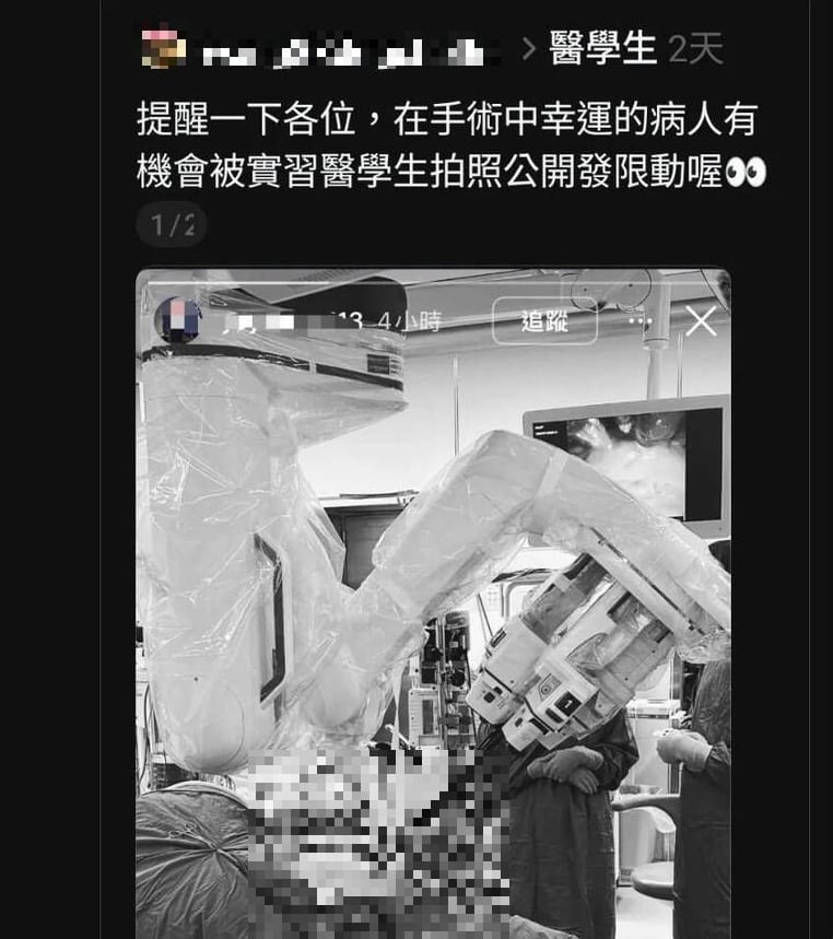 手術室照片外流並在社群平台瘋傳,畫面為醫護正在進行達文西機械手臂手術,機械手臂插入腹部的黑白照片,台中市衛生局查出,涉案為一名台中某醫學系實習期間的醫學生,行為恐違反醫療法,依法可處5萬至25萬元罰鍰。目前院方已責成醫教部及醫學系介入處理與輔導,並加強病人隱私保護相關教育。