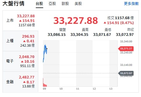 台股今天(11日)開紅漲逾154點,最高站上33304點,上櫃電子與金融類股全揚升。重要電子權值股,約9點20分前,台積電漲20元、來到1900元。鴻海漲1.5元、來到222.5元。廣達跌2.5元、來到282.5元。聯發科跌35元、來到1810元。