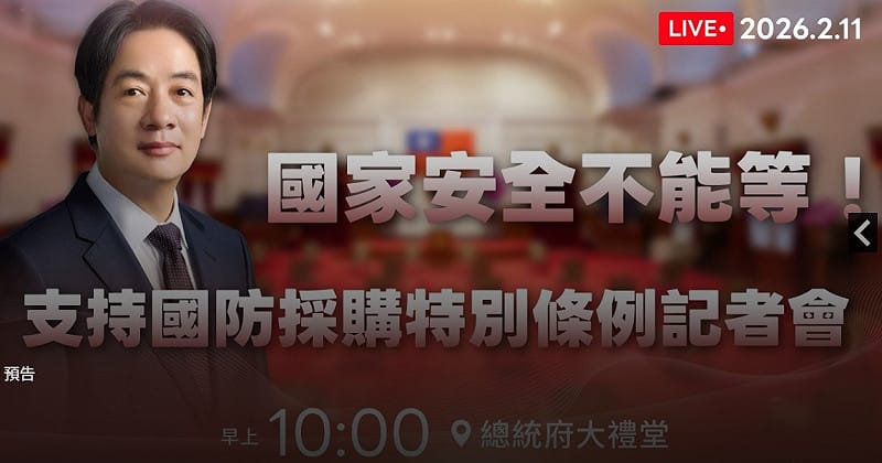 賴政府提出8年1.25兆國防特別條例,但遭在野黨杯葛,至今仍未付委。對此,賴清德總統將於今(11)日上午10點主持「國家安全不能等!支持國防採購特別條例」記者會,再度說明國防特別預算的整體戰略思維與政策方向。此外,國防部長、參謀總長以及陸海空軍司令也都會全數到場,象徵三軍對國防特別預算的共同支持。
