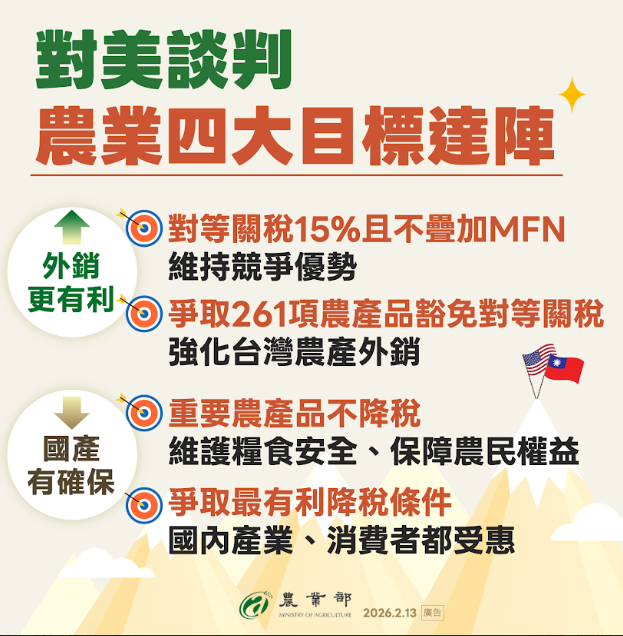 農業部指出,美國是我國最主要的農產品進口來源國,自美進口占全球比例達22.3%,主要進口產品包括大豆、飼料玉米、小麥,牛肉、蘋果等。面對美國要求全面市場開放,農業部為確保糧食安全,尤其稻米是台灣最重要的糧食作物,稻農戶數約22.5萬戶、年產值達新台幣378億元,在秉持「確保產業競爭力、穩定永續發展、保障農漁民權益優先」三大原則下,我方經過多次諮商,最後成功守住稻米不降稅;除稻米外,我國也守住雞肉、牡蠣、蛤、紅豆、大蒜等27項重要產品維持現行稅率。而豬肉、豬雜碎、鴨肉、鵝肉、葡萄、橙及寬皮柑等46項重要產品則將維持一定關稅,其中,豬肉更爭取到3年降稅調適期,確保糧食安全及維護農民權益。