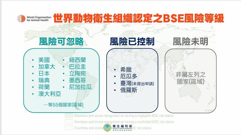 食藥署指出,我國政府以科學實證管理美國牛肉進口。《食品安全衛生管理法》第15條第3項規定,「第一項第三款有害人體健康之物質,包括雖非疫區而近十年內有發生牛海綿狀腦病或新型庫賈氏症病例之國家或地區牛隻之頭骨、腦、眼睛、脊髓、絞肉、內臟及其他相關產製品。」美國於2013年已被世界動物衛生組織(WOAH)認定為牛海綿狀腦病(BSE)「風險可忽略」國家,屬最高安全等級;且WOAH於2023年最新指引指出,僅典型BSE須通報及列入案例計算,美國已逾20年未發生具流行傳播風險的典型BSE案例,因此已非屬《食安法》第15條規範對象。