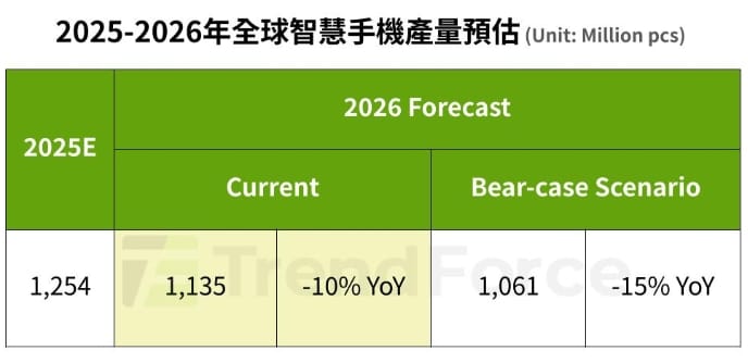 根據TrendForce最新智慧手機研究,2026年全球手機生產表現受記憶體價格高漲影響,恐呈現10%的年衰退,總量約降至11.35億支。然而,記憶體漲勢未歇,加劇終端售價與消費者期望之間的差距,恐導致終端需求更加疲弱。因此,TrendForce進一步預測在悲觀情境(bear-case scenario)下,今年全球手機生產年減幅度將擴大至15%或更甚;而各品牌因產品結構、區域布局不同,受衝擊程度也將各異。
