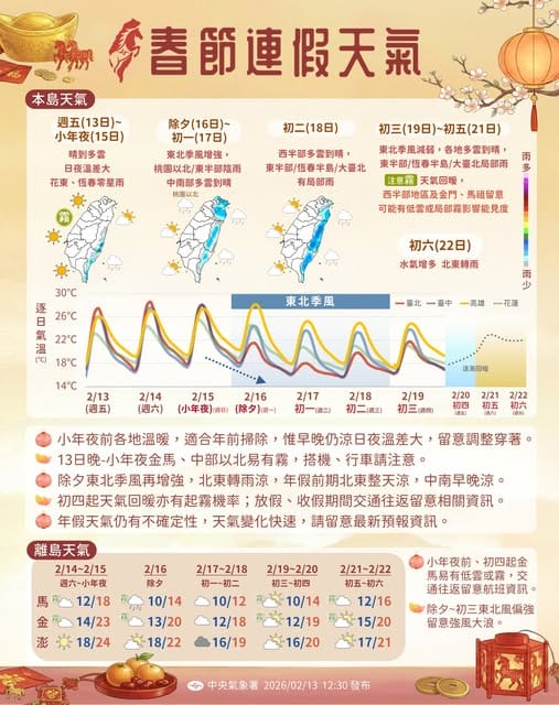 小年夜前(13日至15日)各地大多為晴到多雲,白天暖如春天,體感舒適,不過西半部日夜溫差偏大,清晨與夜間仍有涼意。部分地區易出現濃霧,特別是中南部與離島,清晨及夜間行車須留意能見度變化。