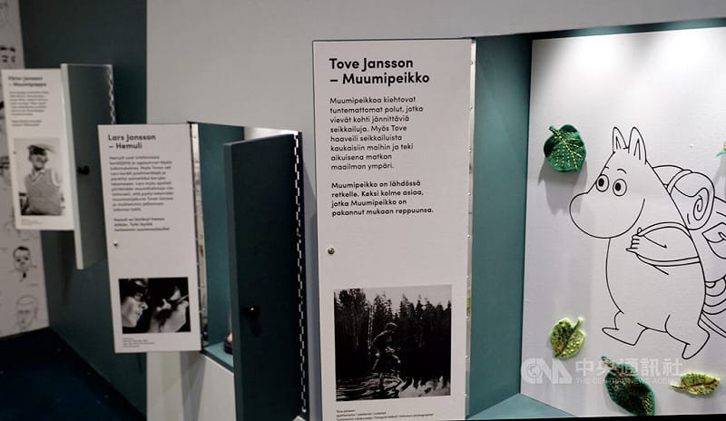 展覽入口處,後方可見本次展覽的核心作品-朵貝.楊笙的巨幅濕壁畫。中央社記者巫祈麟赫爾辛基攝 115年2月14日 圖:中央社提供