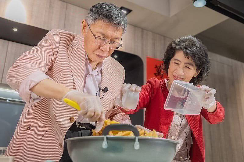國家治理學院院長柯文哲與妻子陳佩琪一起製作甜點沙琪瑪。 圖:民眾黨 / 提供