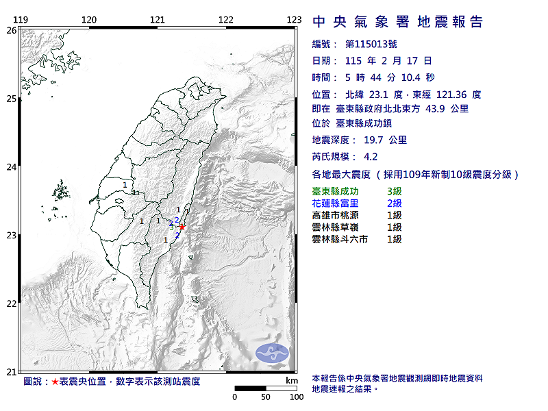 根據中央氣象署資料,02/17-05:44發生芮氏規模4.2有感地震 ,震央位於北緯 23.1度、東經121.36度,地震深度為19.7公里 ,相對位置在臺東縣政府北北東方 43.9 公里 (位於臺東縣成功鎮)。各地最大地震度級: