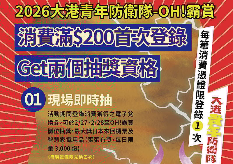 「OH!霸賞」抽獎採「現場即時抽」與「線上加碼抽」雙軌並行。即日起至2月28日止,凡於指定青創店家或冬日遊樂園周邊市集單筆消費滿200元,加入青年局官方LINE(@youth.kcg)完成登錄,即可取得雙重抽獎資格。2月27日、28日「大港青年防衛隊」活動期間,民眾可至駁二淺三碼頭現場參與「即時抽獎」,每組帳號限兌換一次,張張有獎,每日限量3,000份;3月2日則將進行萬眾矚目的「線上加碼抽」,每組帳號最高可累積10組抽獎序號,消費越多,中獎機會越高。