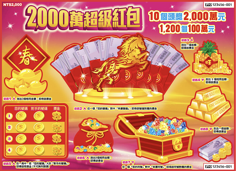 今年農曆春節前,台彩公司共發行 15 款刮刮樂,玩法多元豐富,百萬元以上獎項多達 1,479 個,其中面額最大、頭獎獎金額最高的「2,000 萬超級紅包」,頭獎 2,000 萬元共 10 個、百萬元獎共 1,200 個,總獎金逾 399 億元,刷新歷年春節前發行紀錄。