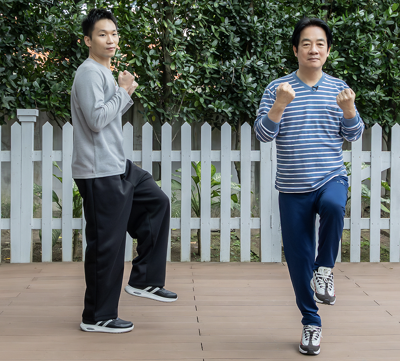 賴清德說,過年期間,大家應該吃很多東西,因此邀請李洋教大家做運動。李洋則說,透過健康操,大家可以在日常居家狀況下進行,保持運動的好習慣,對身體有好處,邀請大家與他一起「每日三十分鐘」,一起運動吧。