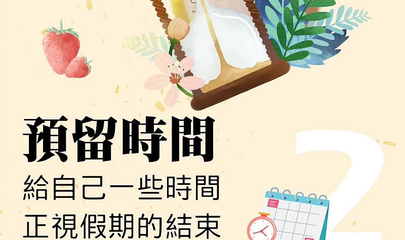 衛生局建議,民眾可從以下四項「收心方式」開始,調整生活作息︰一、清淡飲食,調整節奏:連假期間飲食較為豐盛,容易增加腸胃與身體負擔。建議假期尾聲逐步恢復清淡、均衡飲食,補充蔬果與水分,幫助身體回到正常作息;二、預留時間,平穩轉換:避免將行程安排至連假最後一刻,適度留白與整理環境,提早調整作息,讓身心有緩衝時間,自然過渡至日常生活模式;三、腹式呼吸,放鬆身心:找個安靜的地方,閉上眼睛,慢慢吸氣、再緩緩吐氣,專注感受呼吸的節奏與流動,每天練習5分鐘,有助於啟動副交感神經、穩定情緒,讓緊繃的身體慢慢放鬆;四、散步紓壓,恢復活力:每天安排20至30分鐘的輕度活動,如散步、伸展或簡單運動,可促進血液循環與新陳代謝,提升精神狀態,為開工做好準備。