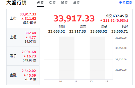 台股今天(23日)開紅漲逾300點,逼近34000點,最高來到33917點,上櫃、電子與金融類股全揚升。聚焦重要電子權值股,約9點5分前,台積電平盤、維持1915元。鴻海漲1元、來到228元。台達電漲55元、來到1315元。廣達漲1元、來到287元。聯發科跌15元、來到1840元。