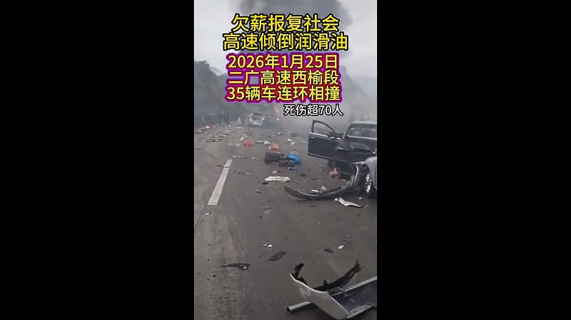 近期中國國內爆發多起因不滿欠薪而報復社會的事件,甚至有民眾在高速公路傾倒潤滑油,造成至少 35 輛車追撞、 70 人死傷的重大意外事故。 圖:擷取自 @POMTQ X 分享影片