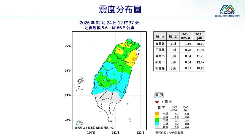 國家災害防救科技中心表示,這起編號第115014號的中央氣象署地震報告顯示,地震發生時間為115年2月24日12時37分15.0秒,震央座標為北緯24.68度、東經121.92度。各地最大震度採用109年新制10級震度分級,宜蘭縣南澳達到4級震度;而宜蘭市、花蓮縣和平、新北市新店、台北市信義區、新北市、桃園市、新竹縣關西、台中市德基、新竹市及苗栗縣後龍等地,震度均為3級。