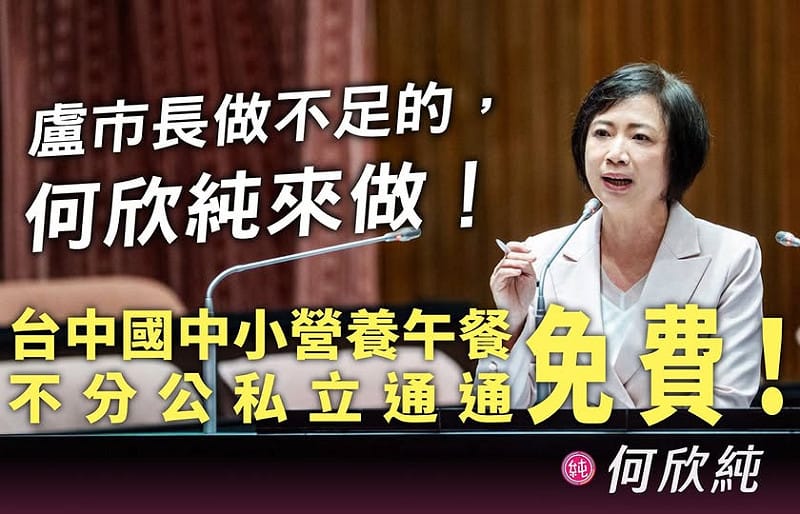 何欣純表示,今年1月初,她提出台中國中小營養午餐免費的主張,沒多久,盧市長隨即宣布今年9月就要實施;雖意外、也不意外,畢竟盧市長總是隨著外界壓力而變化,對於市政建設、照顧市民的那條線,我們始終看不清楚。