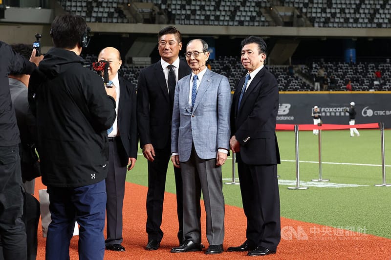 2026台日棒球國際交流賽25日晚間開打,「世界全壘打王」王貞治(前左)現身大巨蛋球場,觀看球員賽前練球情形,並與場邊人員交流意見。中央社記者王騰毅攝 115年2月25日