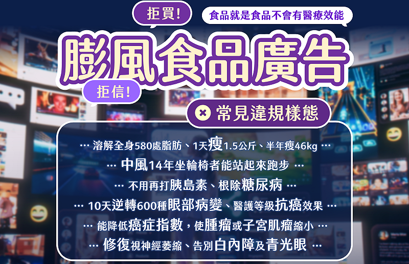 衛生局表示,因3C資訊化普及,大量通訊及社群軟體融入民眾日常生活,許多食品透過電視購物節目及網路廣告擴大販賣營利,動輒宣稱可減肥瘦身、提升免疫力、預防或治療癌症、糖尿病、眼疾、骨骼關節等疾病,已涉誇大不實或宣傳醫療效能,依《食品安全衛生管理法》第28條規定,可處4萬元至400萬元罰鍰,若涉及醫療效能認定,則可加重處60萬元至500萬元罰鍰。