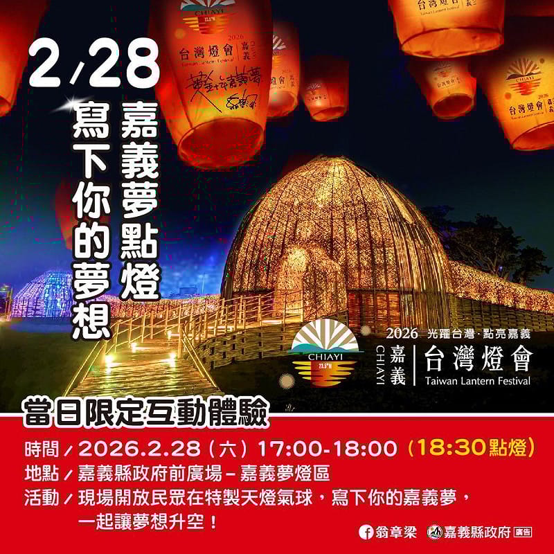 為便利民眾參與活動,當日縣府前地下停車場將免費開放使用,歡迎鄉親踴躍前來,誠摯邀請大家2月28日走進嘉義夢燈區,寫下夢想、見證點燈,在光與希望交織的夜色中,為2026台灣燈會揭開燦爛序幕。