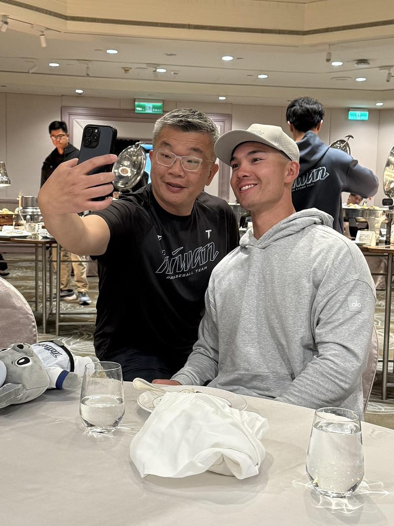 在聯盟工作人員驅趕簽名蟑螂後,費爾柴德搭車前往台灣隊入住的飯店,中華職棒聯盟會長蔡其昌也釋出照片,費爾柴得抵達飯店第一件事就先來跟宵夜中的隊友們打招呼,一起簡單吃個東西!