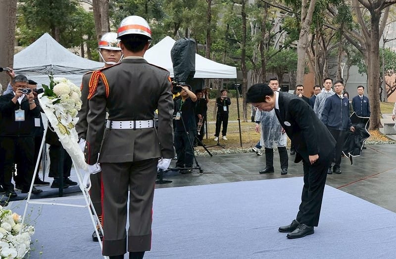 賴清德(前排中)在陳其邁(前排左二)等貴賓陪同下,前往二二八和平紀念碑致意。 圖:高雄市政府/提供
