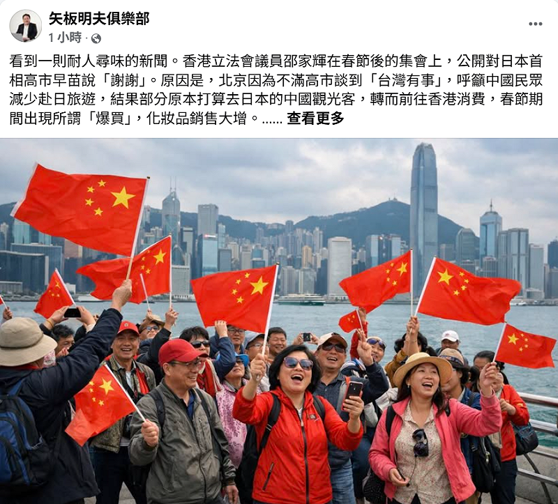 日本資深媒體人矢板明夫今(28)日在臉書發文指出,看到一則「耐人尋味」的新聞。香港立法會議員邵家輝在春節後的集會上,公開向日本首相高市早苗道謝,原因竟是北京因不滿高市早苗提及「台灣有事」,呼籲中國民眾減少赴日旅遊,導致部分原本計畫前往日本的中國觀光客轉往香港消費,春節期間出現所謂「爆買」,化妝品銷售明顯成長。