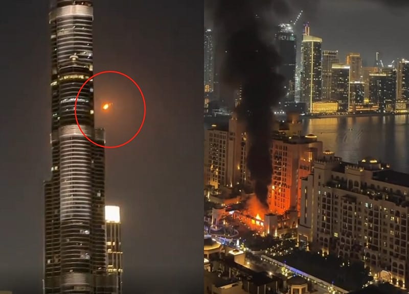 杜拜多處地標遭波及,包括哈里發塔附近攔截導彈、棕櫚島費爾蒙飯店起火、帆船飯店外牆短暫出現火勢。 圖:翻攝X