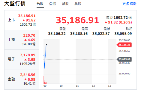 台股今天(3日)開紅小漲91點,最高來到35188,上櫃、電子、金融類股揚升。重要電子權值股F4,約9點15分前,台積電平盤、維持1975元。鴻海平盤、維持239元。台達電跌5元、1420元。廣達跌2元、來到299元。聯發科跌15元、來到1885元。