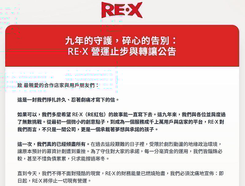 業者日前透過臉書粉專說明,由於 RE·X 的財務能量已燃燒殆盡,因此不得不停止營運,而公司正積極尋求有實力的集團進行「營業讓與」或「策略性併購」,願意以最開放、最低的姿態,尋求強而有力的企業收購接手。