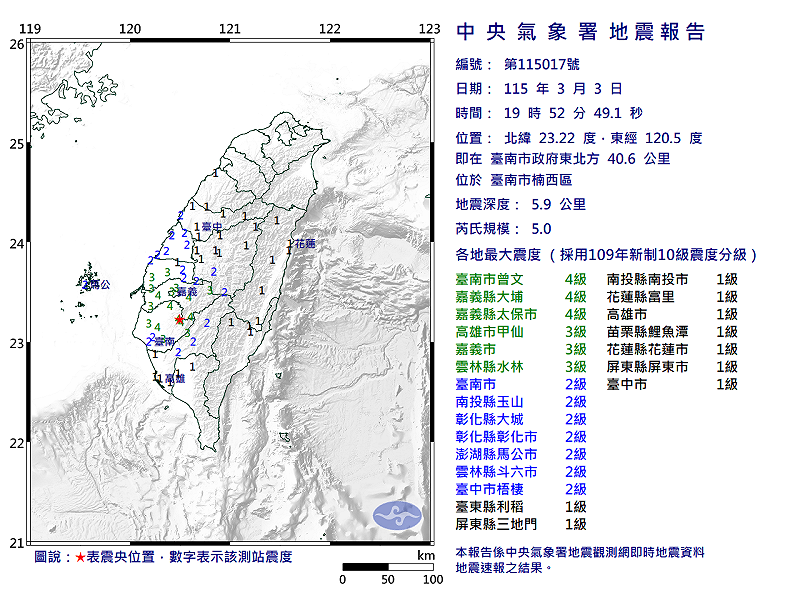 根據中央氣象署資料,03/03-19:52發生芮氏規模5有感地震 ,震央位於北緯 23.22度、東經120.5度,地震深度為5.9公里 ,相對位置在臺南市政府東北方 40.6 公里 (位於臺南市楠西區)。各地最大地震度級: