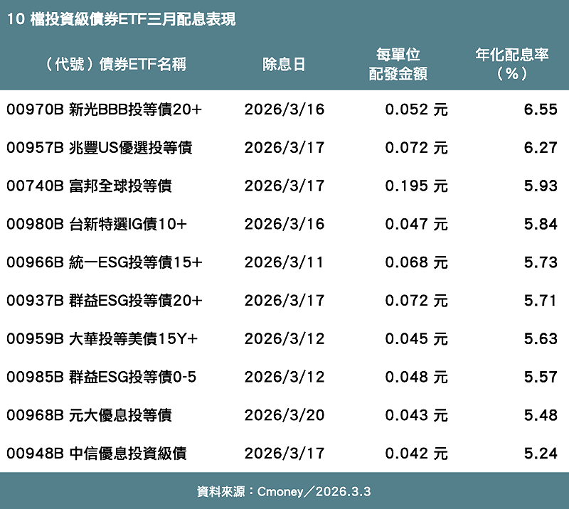 三月是許多債券ETF實施除息的旺月,對於保守型投資人而言,據 CMoney 統計,本月共 19 檔投等債ETF要除息,從年化配息率排序,表現最好前十名包含新光BBB投等債20+(00970B)、兆豐US優選投等債(00957B)2 檔年配息率皆達 6.2% 以上,配息率表現亮眼;而富邦 00740B、台新 00980B、統一 00966B、群益 00937B 與大華 00959B 等,年化配息率也超過 5.5%,配息表現同樣出色。