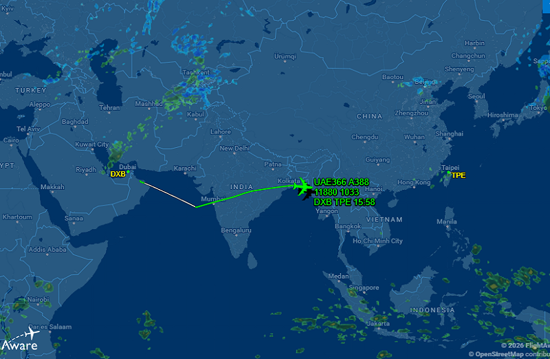 阿聯酋航空EK366航班,今天凌晨3時51分已從杜拜起飛,預計下午3時58分抵達桃園機場第二航廈。 圖:取自桃園機場