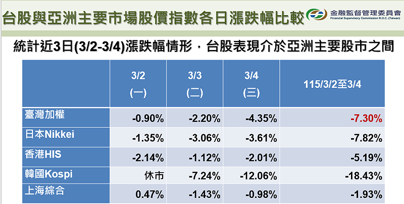 美伊戰爭爆發後,台股本週連續大幅下跌,今(5)天開高反彈,指數一度大漲超過1261點,重新站回34000點,但盤中漲勢收歛至千點以內。行政院會今(5)日安排各部會報告「中東情勢因應」,金管會表示,近期受中東情勢影響,國際股市及台股波動較大,據統計115年3月2日至3月4日台股集中市場跌幅7.3%,亞洲主要股市上海跌1.93%、香港跌5.19%、日本跌7.82%、韓國跌18.43%,台股跌幅介於亞洲主要股市之間。