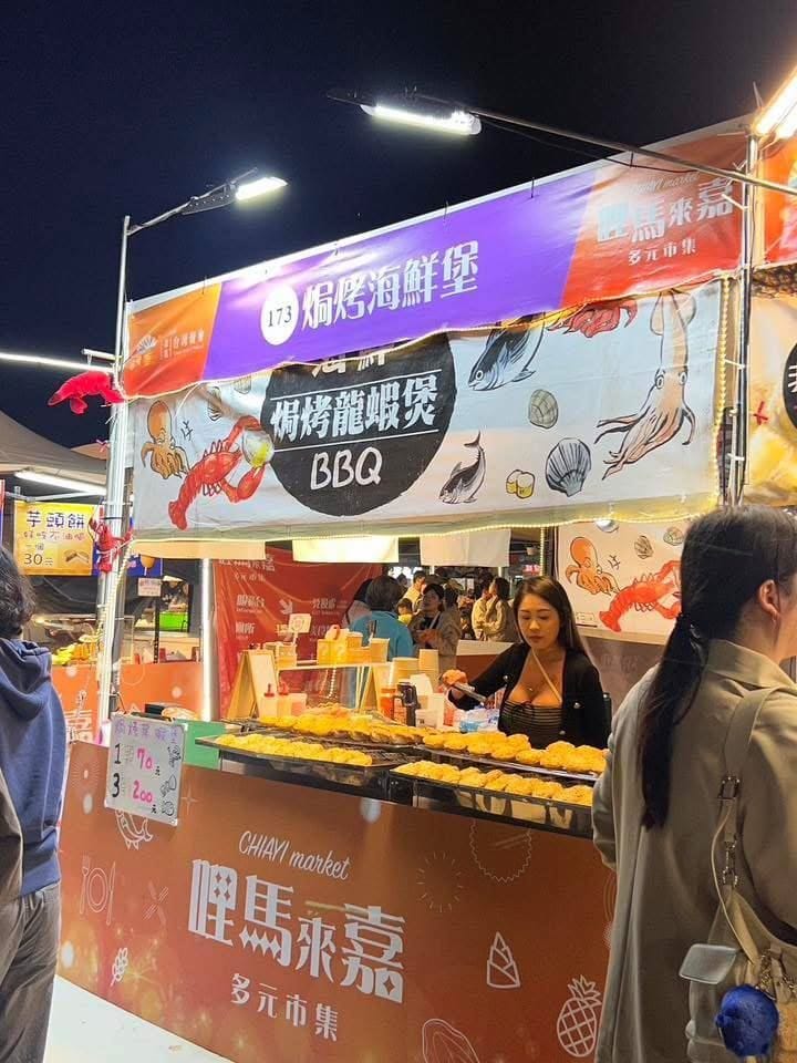 嘉義燈會周邊「哩馬來嘉」多元市集內有諸多美食攤位,其中173號攤位「焗烤海鮮堡」吸引大批遊客,不過更多遊客將目光鎖定在熟練翻動食材的美女闆娘,身著一件黑色貼身低胸背心,大方展現曼妙身材,平口上衣完全包覆不住傲人上圍,成為燈會「嬌」點。