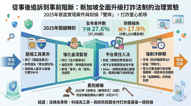 整體而言,新加坡打詐改革呈現明確軌跡:由事後追訴轉向事前預防,由個人責任延伸至平台與金融體系責任,並在必要時以強制力介入。透過降低舉證門檻、強化金流監理、明確平台義務與創設限制令制度,政府為執法機關建立更具主動性的工具箱,並在 2025 年促成案件與財損同步下降。