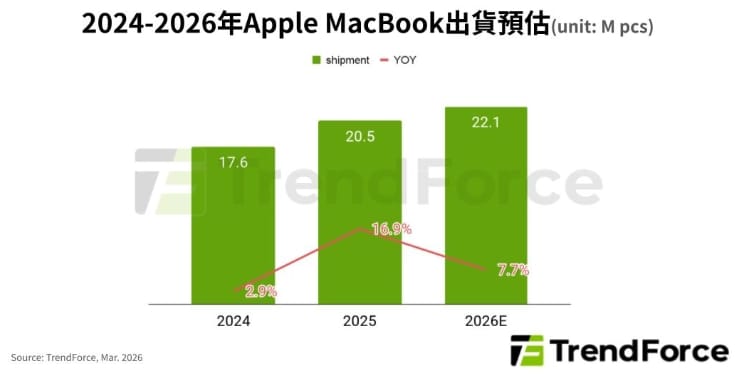 根據TrendForce最新預估,2026年全球筆電出貨量將較前一年衰退9.2%,若需求維持疲弱,跌幅恐將擴大。然在全球筆電產業面臨記憶體和CPU同時缺貨、漲價,多數品牌選擇縮減產品、保守控管庫存之際,Apple反向操作推出入門筆電新機MacBook Neo,建議售價自599美元起跳,鎖定教育市場與主流文書應用機種500-800美元價格帶,顯示見其明確的產品與生態系佈局野心。