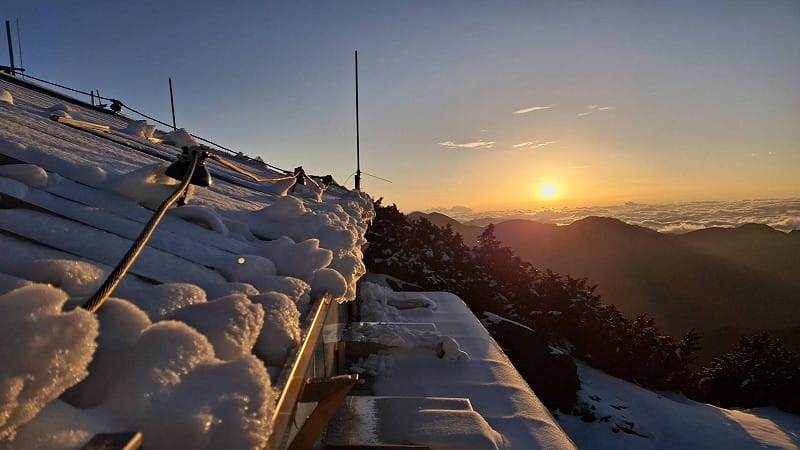 前2天玉山氣象站都有下雪。氣象署指出,今天全台最低溫為玉山風口的零下3.7度,玉山測站也只有零下0.9度低溫,上午仍有早上仍有積雪約5公分。氣象署也公布一連串美照,從照片中可以看到今天清晨天氣晴朗,日出光揮灑在尚未融化的積雪上,將山頭染成橘紅色,搭配山後的雲海,畫面美得像明信片。
