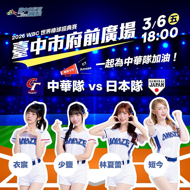 台中市政府表示,府前廣場將以全國最大1,300吋巨型螢幕直播賽事,並邀請職棒人氣應援團長中信兄弟「53哥」,以及CT AMAZE啦啦隊成員短今、少鹽、林夏蕾、衣宸到場帶領球迷熱血應援。現場同時規劃抽獎活動,送出經典賽周邊商品等多項好禮,讓球迷邊看球邊參與互動。
