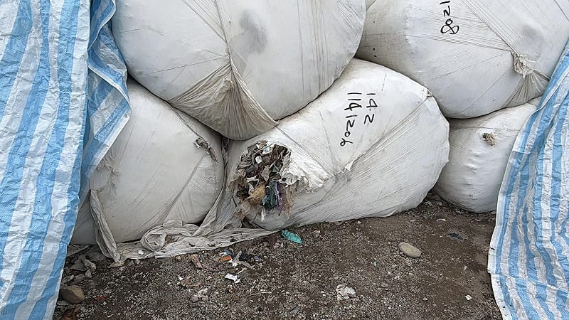台中市議員何文海昨(5)日實地視察文山掩埋場太空包堆置場,並發現場內垃圾太空包許多地方已經發生破損,許多垃圾廚餘外露,恐造成周邊環境污染,顯示台中市政府打包垃圾政策徹底破功。 圖:何文海/提供