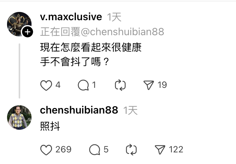 前總統陳水扁近日在社群媒體Threads(脆)親自回應,與脆友互動頻繁。除了有扁迷東問西問,他都親回應外,對於一些不友善的提問,他也不客氣回嗆。例如有脆友問他健康、手不抖了嗎?他嗆回「照抖」。對於「海角七億」,他則回只有電影「海角七號」,沒有「海角七億」。對於有人孫說,「可以走路了喔 阿扁總統」,他則回,「我8個月大一點就會走路了」。