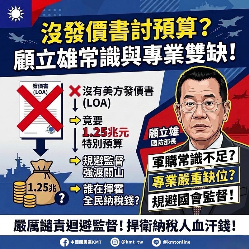 國民黨表示,現實是,國防部長顧立雄連基本軍購常識與專業都不清楚。美國海外軍事售予(FMS)制度:不清楚。美方同意供售的官方文件–發價書(LOA):拿不出。確切買什麼、何時交貨:不知道。就這樣要強渡關山、規避立院審查,要立院空白授權,草率編列預算,讓全民舉債承擔,荒謬行徑史無前例。